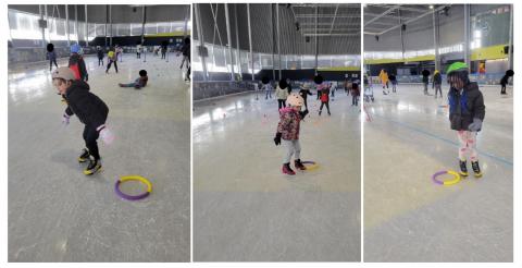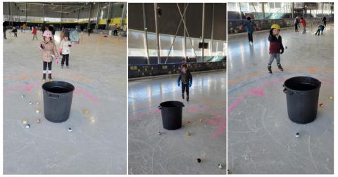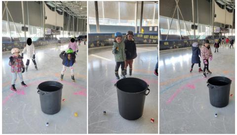 Nous terminons la séance par un nouveau jeu : chacun prend une balle, traverse la piste et va la lancer dans un panier situé de l’autre côté de la patinoire.