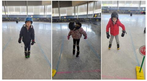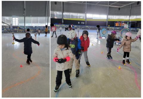 Nous reprenons ensuite le parcours de la semaine dernière en y ajoutant quelques nouveaux exercices: slalomer entre les plots, tourner autour de l’anneau, s’arrêter au panneau STOP puis se retourner pour patiner en arrière en faisant le « chapeau pointu ».